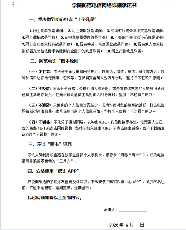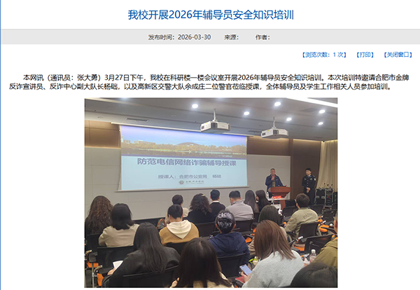 针对学生工作一线力量,学校联合学工口组织开展了2026年辅导员防范电信诈骗安全知识培训。培训围绕当前高发电诈类型、学生易受骗场景及应急处置流程等内容进行系统讲解,有效提升了辅导员的识别、干预和引导能力。同时,学校要求各二级学院签署反诈承诺书,层层压实责任,形成“学院—班级—宿舍”三级联动的反诈工作机制。