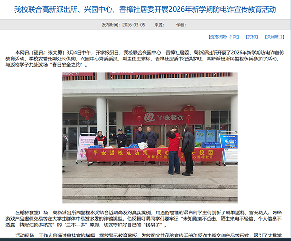 开学初,我校联合高新派出所、兴园中心、香樟社居委共同开展了2026年新学期防电诈宣传教育活动。活动现场,公安民警结合真实案例,向师生详细讲解了刷单返利、冒充客服、虚假贷款等常见诈骗手段,提醒大家做到“不轻信、不透露、不转账”。与此同时,香樟社区积极支持我校反诈工作,组织人员来校张贴防诈宣传条幅,在校园主干道、食堂、宿舍区等醒目位置营造出“时时提醒、处处防范”的浓厚氛围。
