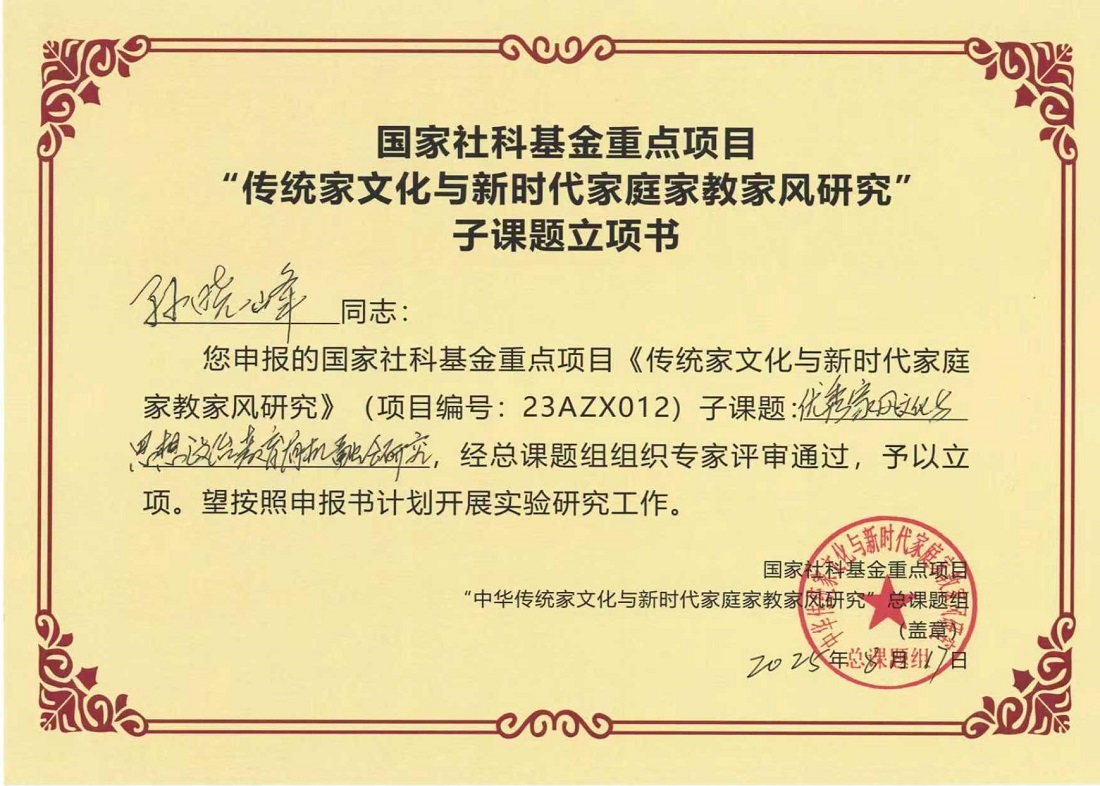 本网讯(通讯员:李彩平)近日,国家社科基金重点项目《传统家文化与新时代家庭家教家风研究》召开开题培训会。我校大学生素质教育研究中心研究员孙晓峰教授作为子课题负责人,申报的子课题《优秀家风文化与思想政治教育有机融合研究》经专家组审核,成功获批立项。