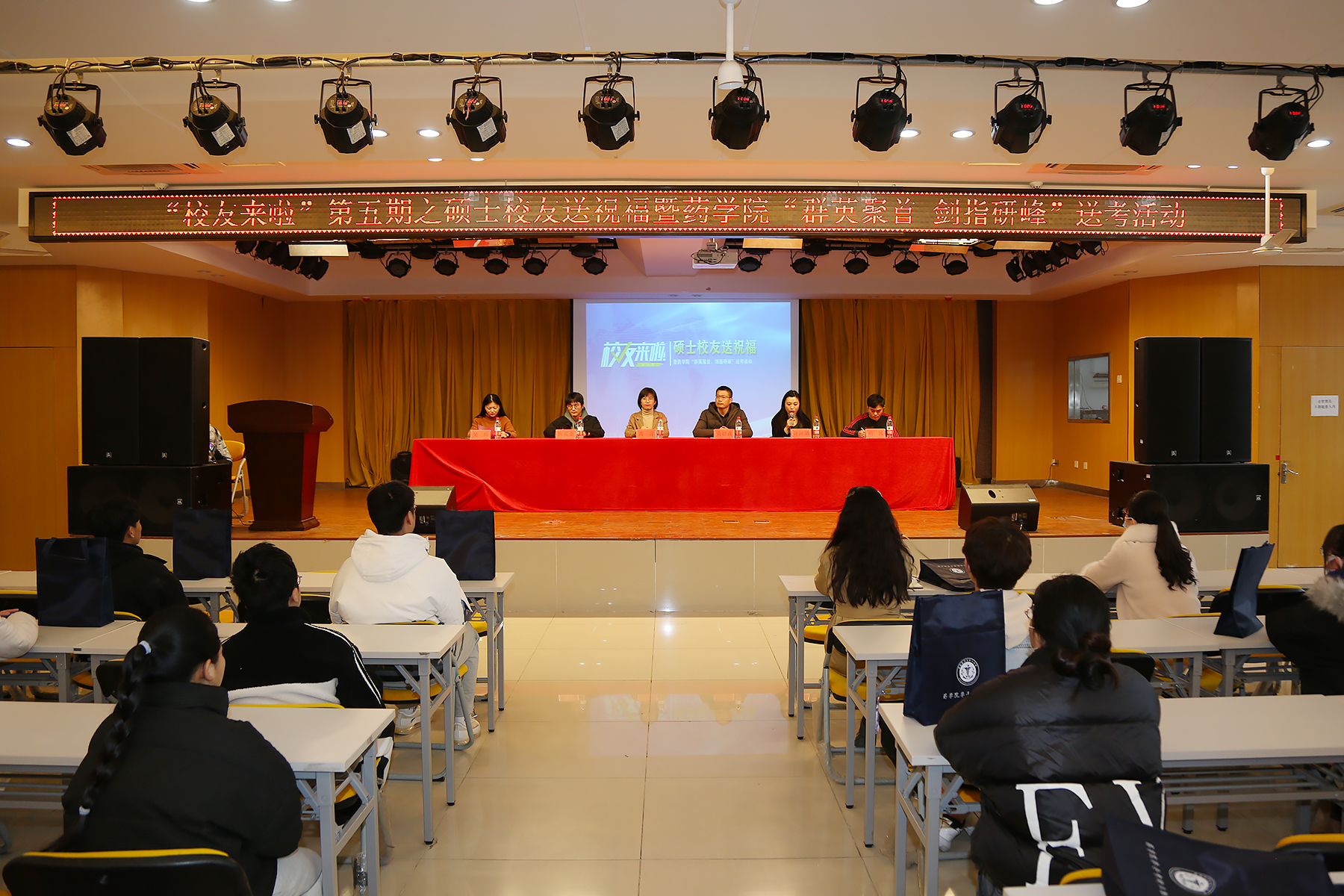 本网讯(通讯员:朱格格、陈鹏 摄影:翟漱文)12月15日,我校药学院举办了“校友来啦”第五期之硕士校友送祝福暨药学院“群英聚首 剑指研峰”送考活动。药学院执行院长黄德垚、校友办主任芮萍,硕士校友何英豪、吴琼、胡波以及180名考研学子代表出席活动。活动由药学院院长助理汪涵涵主持。