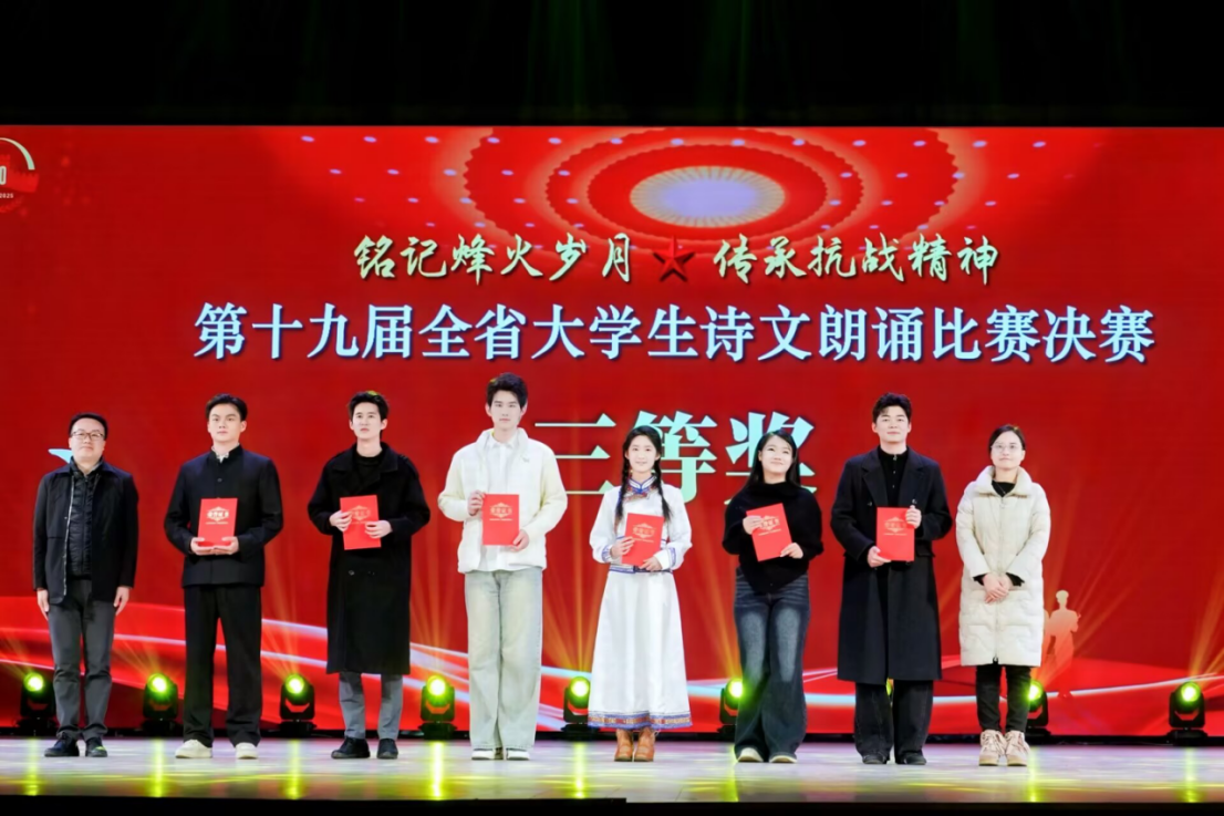 本网讯(通讯员:郑帅)11月26日至28日,第十九届全省大学生诗文朗诵比赛决赛在安徽师范大学(花津校区)举行。我校选送的四部作品分别斩获三等奖2项,优秀奖2项,学校荣获优秀组织奖。