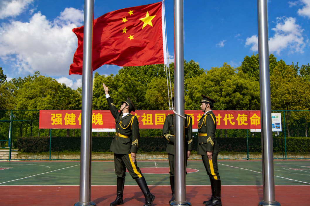 入场仪式结束后,全场肃立,升国旗、唱国歌。嘹亮的歌声回荡赛场,爱国之情在师生心中升腾。