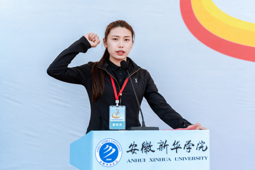 文体展演落幕,盛会迎来高光时刻。省督导专员、校党委书记邸建伟郑重宣布:安徽新华学院第十七届田径运动会正式开幕!全场瞬间欢声雷动、掌声四起,成为一片欢乐海洋。