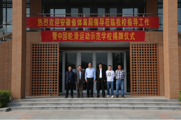 本网讯(通讯员:王军,摄影:陆如海)2015年11月,经省体育局和轮滑协会的推荐,我校正式被中国轮滑协会评为“中国轮滑运动示范学校”,有效期为2015年至2017年。4月13日,我校“中国轮滑运动示范学校”揭牌仪式在学术报告厅举行,安徽省体育局社会体育指导中心书记王勇、副校长杨世国共同揭牌。安徽省体育局社会体育指导中心副主任王峰、公共课教学部主任王士赵、体育教研室副主任王军和公共课教学部体育教研室全体教师参与了揭牌仪式。揭牌仪式由王士赵主持。