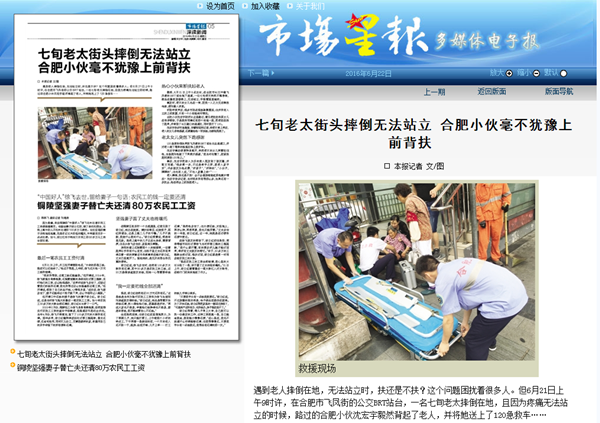本网讯(王友雅)6月21日上午9时许,在合肥市飞凤街的公交BRT站台,一名七旬老太摔倒在地并因疼痛无法站立,我校信息工程学院学子沈宏宇路过,毅然背起了老人,并将她送上了120急救车。沈宏宇事后便要转身离开,老太的女儿激动地着拉住他,非要表示感谢,而沈宏宇称这是“义不容辞的事情。”