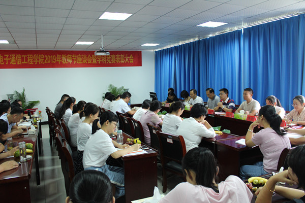 9月4日电子通信工程学院举办了2019年教师节座谈会暨学科竞赛表彰大会。全体教师欢聚一堂,分享学科与科技竞赛指导经验与感悟。副校长杨世国、执行院长王琦进,副院长舒敬荣、柯姗姗,院长助理李长凯以及全体教职员工参加了座谈会。会议由王琦进主持。