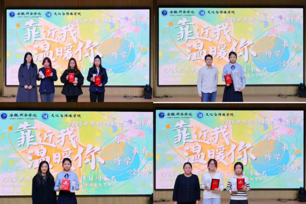 话音落处,获奖名单随之揭晓:吴彤彤不仅摘得一等奖,更将“最具感染力”“最佳故事奖”一并收入囊中;方舒婷、沙靖琪拿下二等奖;韩莹莹、陈创、程果获三等奖;陈玉婷、陈紫娴、陈怡辰、王棋、王文豪获评优秀奖。文化与传媒学院和艺术学院获得“心理健康教育工作先进集体”。证书与掌声里,现场人员合影定格下笑意,这场以“心”为名的聚会也落下帷幕。