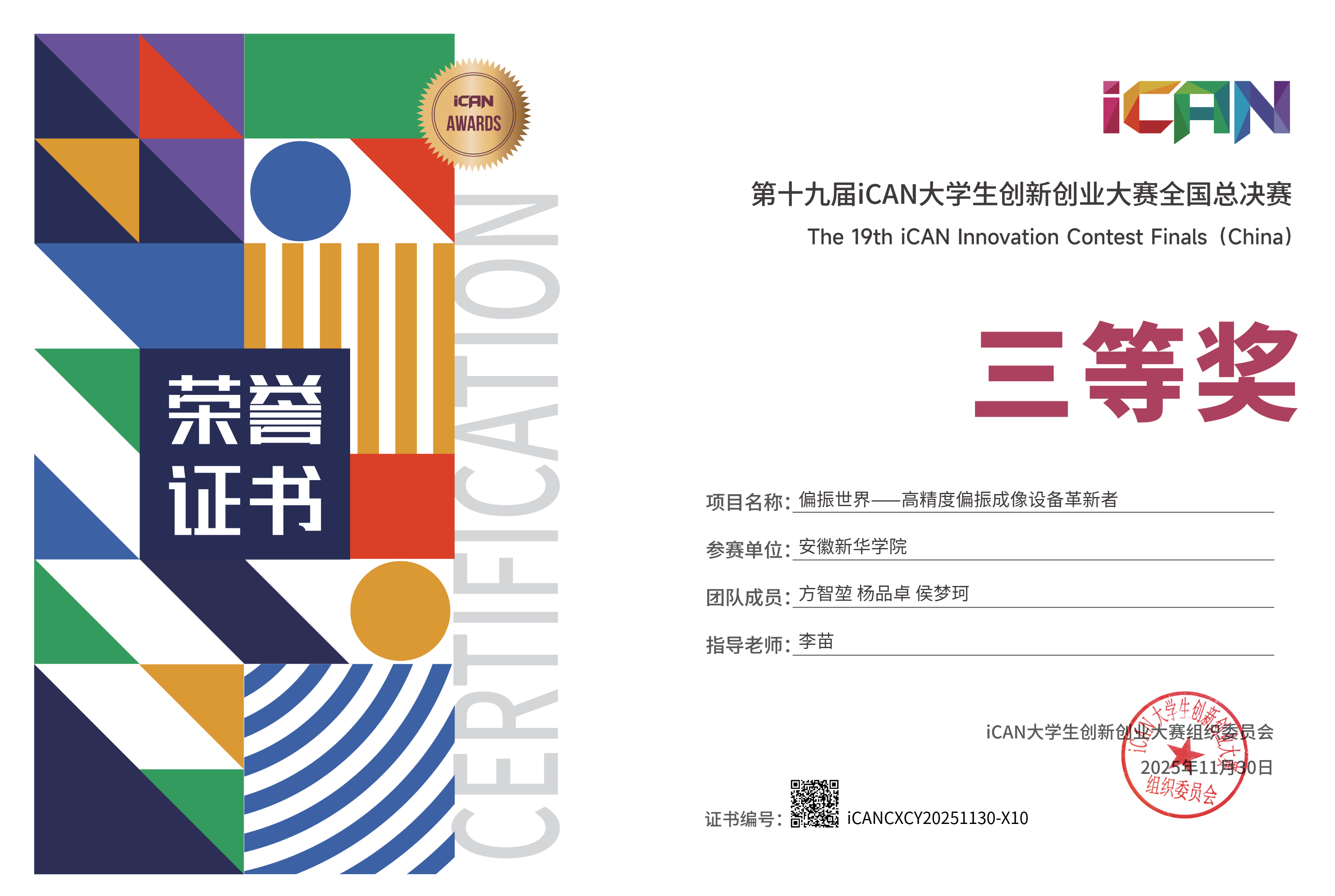 此次“偏振视界”团队斩获iCAN大赛国家级三等奖,不仅是安徽新华学院大数据与人工智能学院的骄傲,更是学校创新创业教育的又一重要里程碑。未来,学校将继续深耕创新创业教育,完善培养体系、搭建实践平台,助力学生成长为科创领域高素质人才,为国家创新发展提供更多人才支撑。