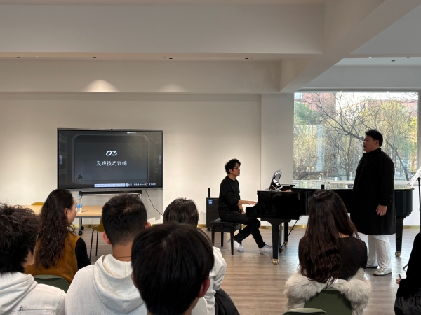 随后,声乐教研室负责人王昊星老师协同学生董富康,围绕歌剧《茶花女》选段“沸腾激动的心灵”开展声乐演唱教学公开课。王昊星老师以作品背景解读为切入点,从发声技巧训练、作品演唱处理两个核心层面展开教学,针对学生演唱中宣叙调部分的咬字清晰度,以及咏叹调部分的表达层次感等问题,进行了精准调整、系统讲解与针对性指导,完整展现了声乐专业作品教学的严谨逻辑与实践路径。