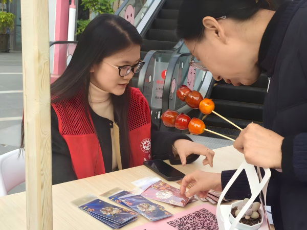 在非遗美食区,糖画、糖葫芦及青团制作体验吸引了众多亲子家庭参与。我校志愿者协助非遗传承人进行材料分发与流程讲解,引导孩子们在动手实践中感受传统文化魅力。绿植兑换区同样人气高涨,居民通过回收纸盒、塑料瓶等物品兑换绿植,在环保实践中增强生态意识。