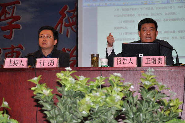 讲座中王南贵围绕当前校园中存在的安全隐患、大学生如何防止意外事件的发生、如何提高自身的安全责任意识三个方面展开。主要内容涵盖校内防骗常识、防盗防火安全、交通安全、防食物中毒、防传销、宿舍安全、政治安全等多个方面。王南贵结合发生在校园里的一些真实案例,给同学们讲解了各类安全问题的应对措施并向同学们讲述了一些防偷盗、防伤害、防诈骗的经验,让同学们遇到类似情况时能从容应对。讲座中他通过发生在学生身边的具体安全事故强调了了解基本安全知识的重要意义,为同学们的日常生活提供了很大的帮助。