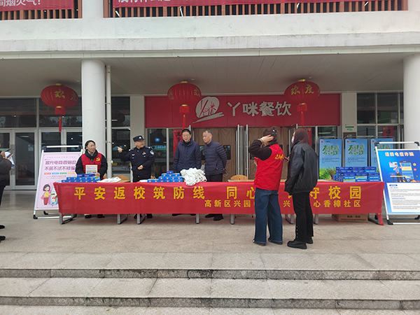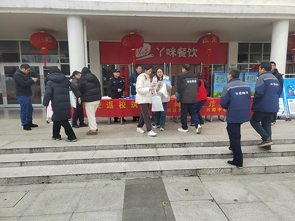 本网讯(通讯:张大勇)3月4日中午,开学报到日,我校联合兴园中心,香樟社居委、高新派出所开展了2026年新学期防电诈宣传教育活动。学校安管处副处长仇陶,兴园中心党委委员、副主任王宏标,香樟社居委书记洪家旺,高新派出所民警程永兵参加了活动,与返校学子共赴这场“春日安全之约”。
