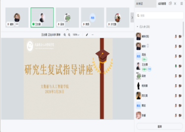 本网讯(通讯员:崔妹)为帮助通过学院研究生初试的学子明晰复试流程、找准备考重点、掌握应对策略,切实提升录取成功率,缓解备考焦虑,3月26日大数据与人工智能学院组织开展研究生复试指导线上讲座,邀请校外考研升学专家王老师为全体进面学子送上干货满满的“复试锦囊”,助力学子们从容应战、圆梦研途。