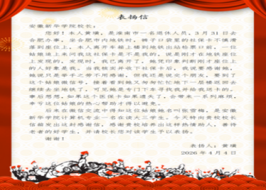 本网讯(通讯员:张韬)近日,一封来自淮南市退休市民黄璜的感谢信寄至安徽新华学院校长信箱。信中,黄先生深情讲述了我校学生张雪梅助人为乐的暖心事迹,对学校育人成效给予高度赞扬。