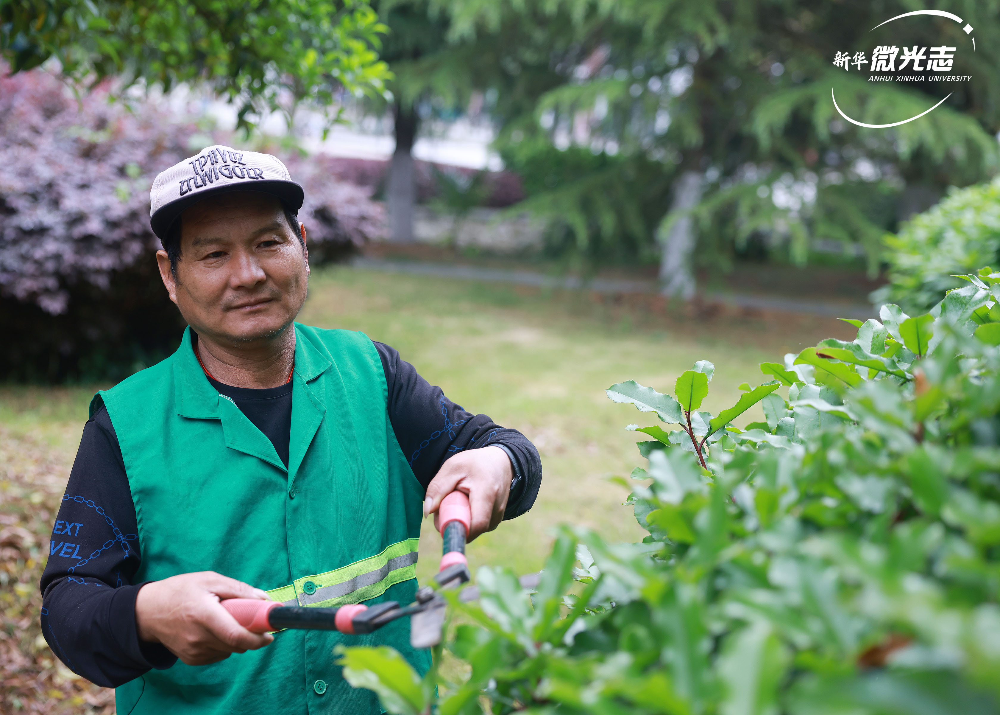 在郑师傅心中,安徽新华学院不仅是工作单位,更是一个“家”。他常叮嘱工友,干活要往实处走,凡事都要为学校多考量。人员分配上,他坚持按需分配的原则——一个人能高效完成的活,绝不盲目增派人手。每逢雨雪天气来临前,他总会提前排查校园内的枯枝,组织清理,全力避免树枝坠落带来的安全隐患,用细致周全的准备守护师生出行安全,真正把学校的事当作自家的事来用心经营。