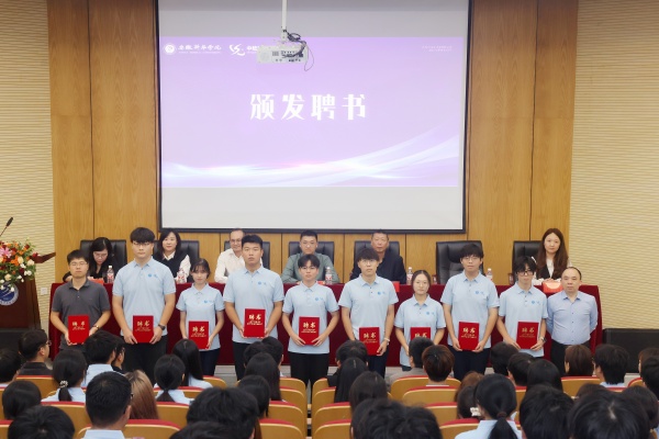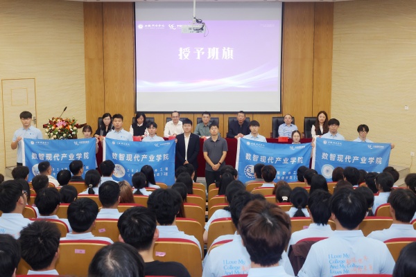 吴章勇为企业班主任及2025级学生干部授予聘书,校企双方班主任为2025 级新生班级授予班旗,象征着校企协同培育新生力量的正式启动。