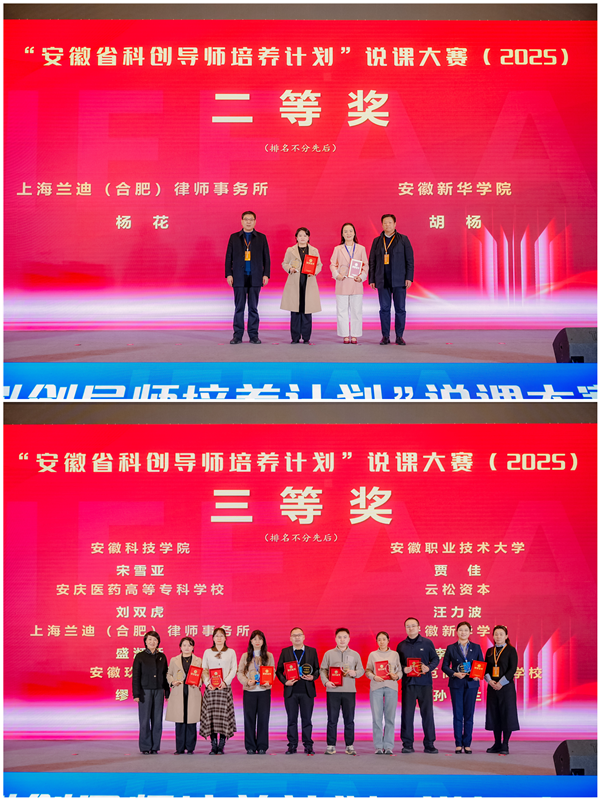 本网讯(通讯员:陈启虞 胡杨)12月20日,2025年安徽省科创导师培养计划说课大赛在合肥融创永乐半山酒店圆满结束。我校两位参赛教师凭借优异表现荣获佳绩——文化与传媒学院教师胡杨获二等奖,艺术学院副教授李薇薇获三等奖,展现了我校在创新创业教育领域扎实的师资力量与教学水平。