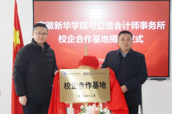 贺行佳与周华伦为“安徽新华学院与立信会计师事务所校企合作基地”揭牌。