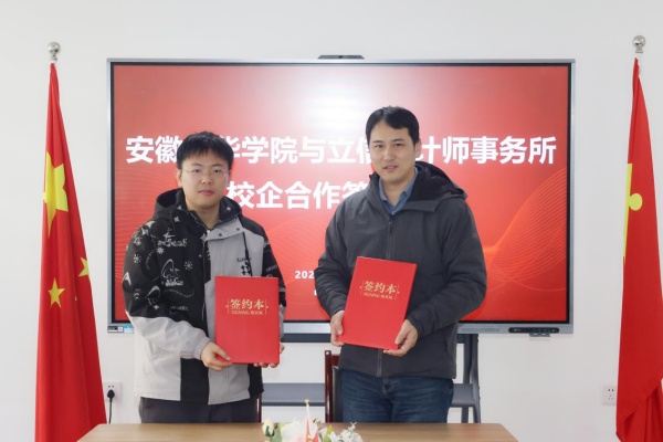 在校企双方代表共同见证下,吴山与洪峰共同签署《安徽新华学院与立信会计师事务所校企合作框架协议》。