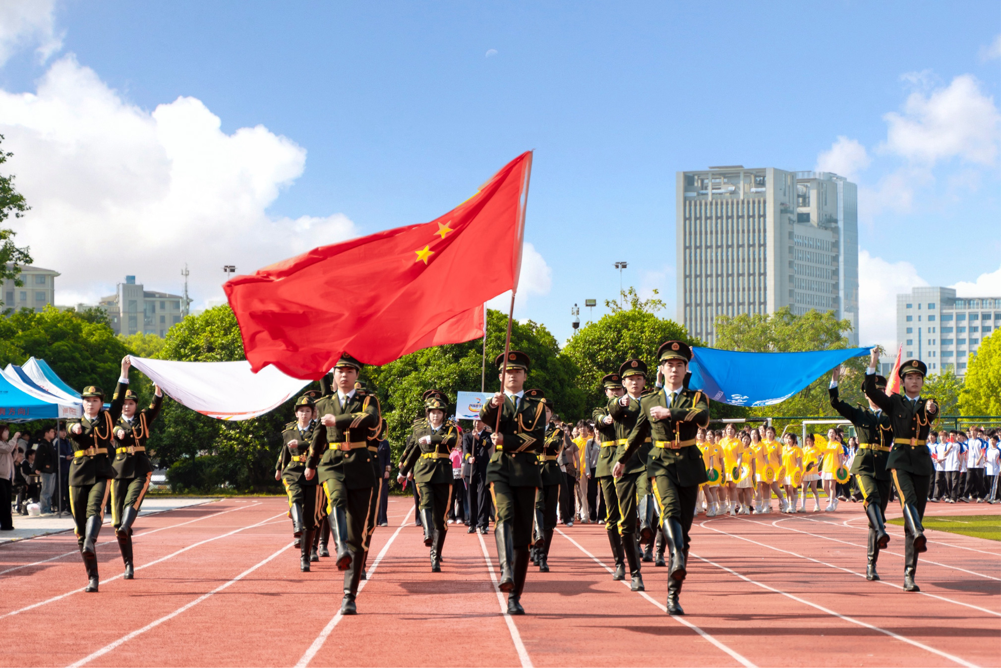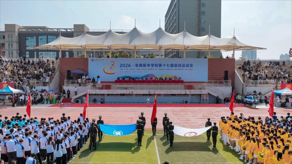 方阵亮相,特色纷呈。开幕式在庄严有序的氛围中拉开帷幕。气宇轩昂的国旗护卫队率先入场,队员们身姿挺拔、步伐铿锵,护卫着国旗、校旗与会旗稳步前行,目光坚定、神情庄重,尽显新华学子的赤诚与担当。紧随其后,各二级学院、教职工及裁判员方阵依次亮相,各具特色的展演成为赛场亮点。