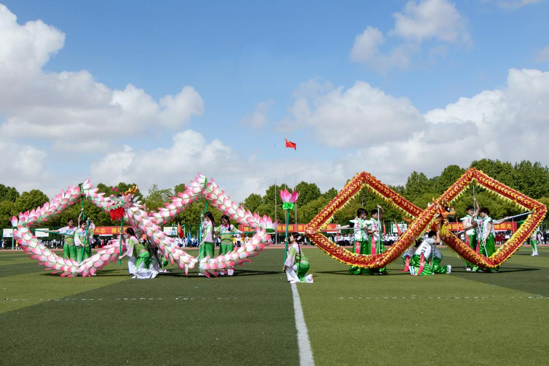 正式开赛前,精彩的文体表演将现场气氛推向高潮。通识教育部舞龙舞狮俱乐部带来《荷韵双龙•耀新华》,双龙翻腾、刚柔相济,传承中华传统文化。