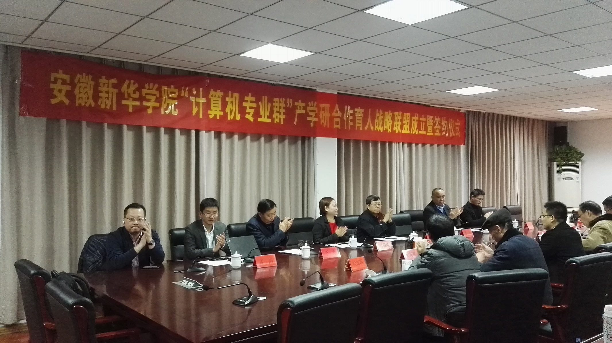 本网讯(通讯员:聂欢欢)12月20日,我校“计算机专业群”产学研合作育人战略联盟成立暨签约仪式在第一会议室顺利举行。校长石秀和、中国科技大学教授及安徽计算机学会秘书长徐云、合肥学院计算机系系主任檀明、合肥城市云数据有限公司常务副总经理李晓洁、华信智原安徽分公司总经理李勇、中软国际有限公司安徽分公司经理韦东成、联想安徽分公司经理庞浩、翡翠集团安徽分公司经理吴涛、科研处副处长王琦进、信息工程学院全体管理人员以及部分教师代表参加了仪式。会议由执行院长贺行佳主持。
