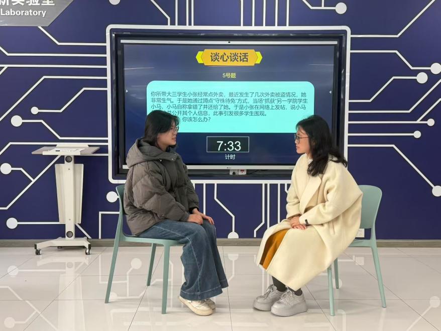 “谈心谈话” 环节则聚焦育人实践场景,选手面对由学生模拟扮演的谈话对象,精准把控沟通节奏,注重思想引导与情感关怀。在耐心倾听中了解诉求,在真诚交流中化解矛盾,在精准指导中解决问题,将“围绕学生、关照学生、服务学生” 的工作理念贯穿始终,展现了辅导员队伍过硬的沟通协调能力与人文关怀素养。