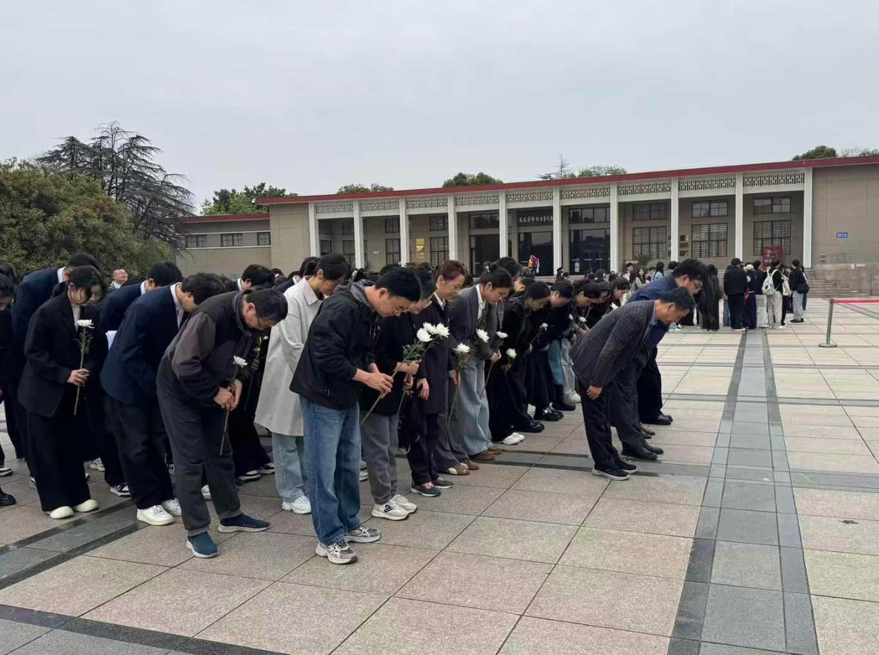 15时10分,祭奠仪式在庄严的氛围中启幕。师生代表们神情肃穆,对革命先烈充满着无限崇敬与深切缅怀。悠扬深情的《献花曲》萦绕耳畔,文化与传媒学院党总支书记洪玉与合肥市新四军历史研究会常务副会长兼秘书长王德桡代表全体师生向先烈敬献花篮。随后,全体师生缓步绕行,俯身敬献鲜花,深深鞠躬。