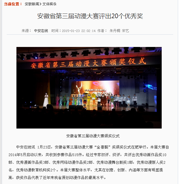 安徽日报、新安晚报、安徽商报、中安在线报道我校承办安徽省第三届动漫大赛“金喜鹊”颁奖仪式